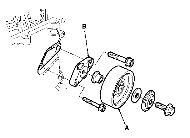 13. Remove the idler pulley (A), then remove the idler pulley base (B).