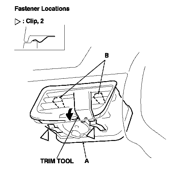 1. Carefully insert a trim tool next to the clips, and detach the clips by prying on the passenger's side vent (A). Take care not to scratch the dashboard or related parts.