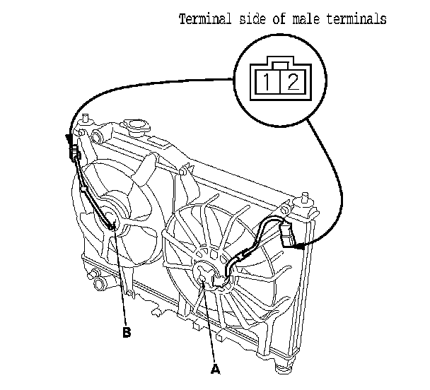 1. Disconnect the 2P connectors from the radiator fan motor (A) and the A/C condenser fan motor (B).