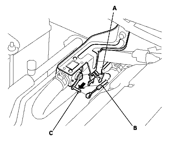 3. From under the hood, open the cable clamp (A), then disconnect the heater valve cable (B) from the heater valve arm (C). Turn the heater valve arm to the fully opened position as shown.