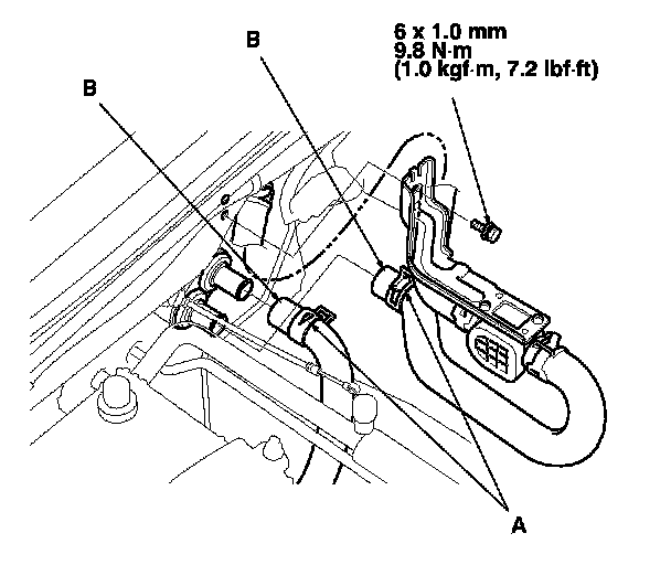 5. Remove the mounting bolt from the heater valve. Slide the clamps (A) back, then disconnect the inlet and outlet heater hoses (B) from the heater unit. Engine coolant will run out when the hoses are disconnected; drain it into a clean drip pan. Be sure not to let coolant spill on the electrical parts or the painted surfaces. If any coolant spills, rinse it off immediately.