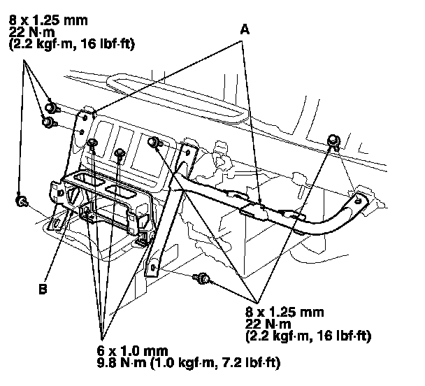 9. Remove the mounting bolts, the center brackets (A), and the audio bracket (B).