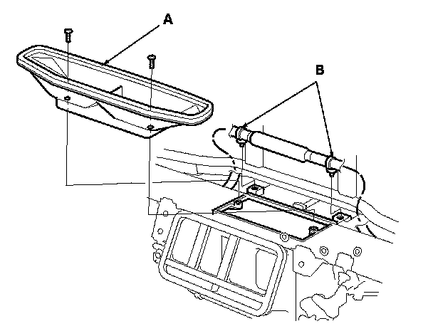 11. Remove the self-tapping screws and the defroster outlet (A), then remove the wire harness clips (B).