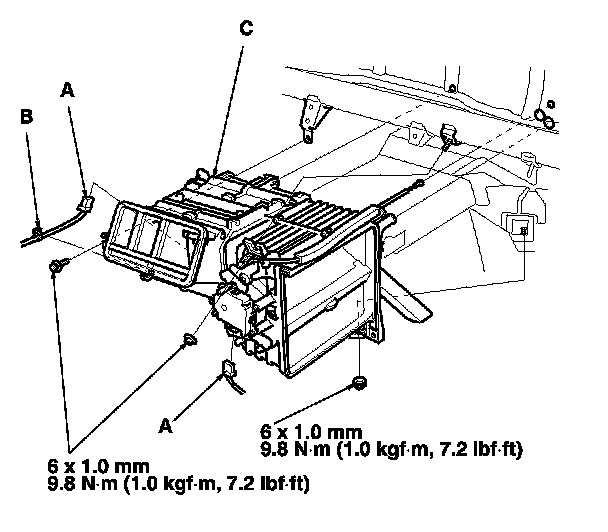 12. Disconnect the connectors (A) from the mode control motor and the air mix control motor, then remove the wire harness clip (B). Remove the mounting nuts, the mounting bolt, and the heater unit (C).
