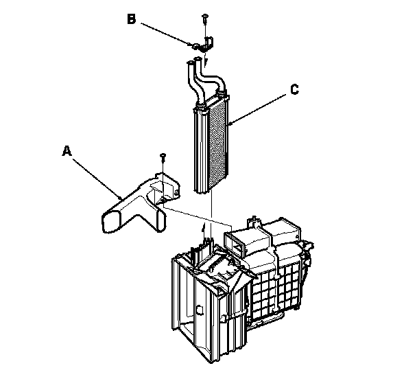 13. Remove the self-tapping screw and the passenger's heater outlet (A), then remove the self-tapping screw and the clamp (B). Pull out the heater core (C), taking care not the bend the inlet or outlet pipes.