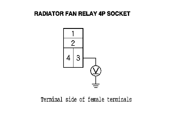 5. Measure the voltage between radiator fan relay 4P socket terminal No. 1 and body ground.