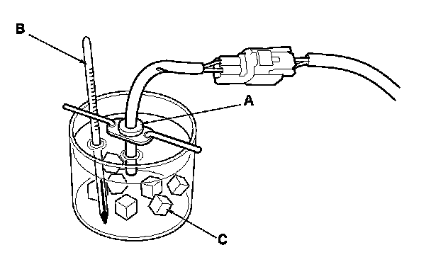 NOTE: To recalibrate the display to the true temperature, remove the outside air temperature sensor (A), but leave it connected. Submerge the sensor and a thermometer (B) in a container of ice water (C). Select the calibration mode as described above, then recalibrate the display to the true temperature.
