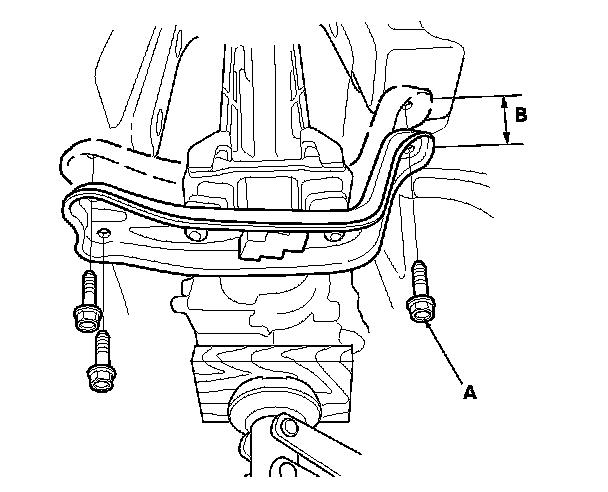 6. Place a floor jack under the transmission, and remove the three transmission rear mount bolts (A), and then lower the transmission 65 mm (2.56 in.) (B).
