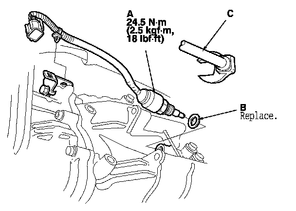 7. Replace the back-up light switch (A) and the sealing washer (B) using the commercially available 3/8'' crow foot wrench (19 mm) (C).