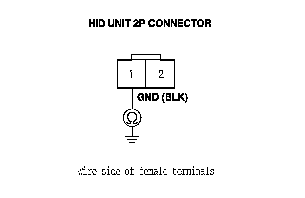 15. Check for continuity between the HID unit 2P connector terminal No. 1 and body ground.