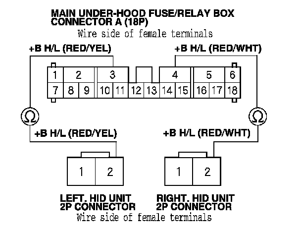 18. Check for continuity between main under-hood fuse/relay box connector A (18P) terminals No. 3 or No. 4 and the appropriate HID unit 2P connector terminal No. 2.