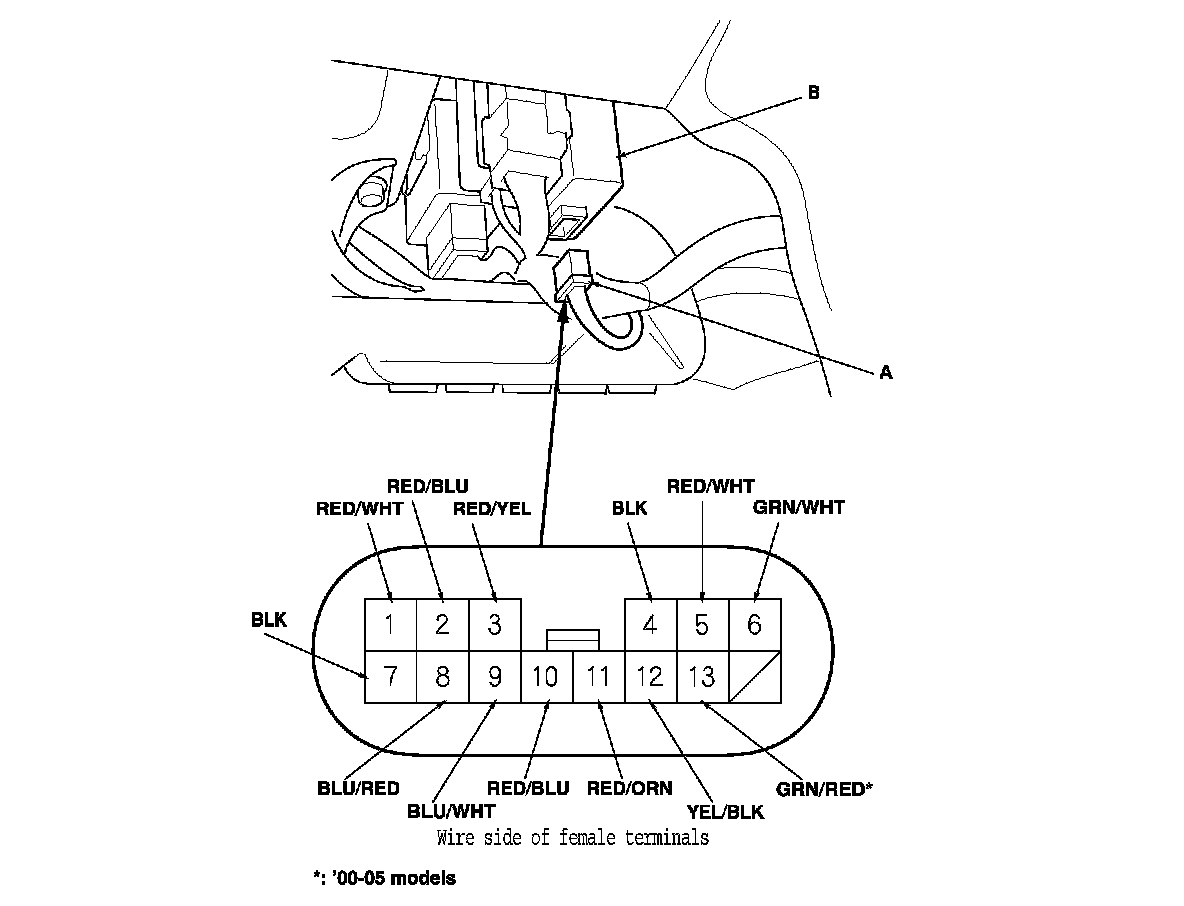 1. Disconnect the 14P connector (A) from the daytime running lights control unit (B).