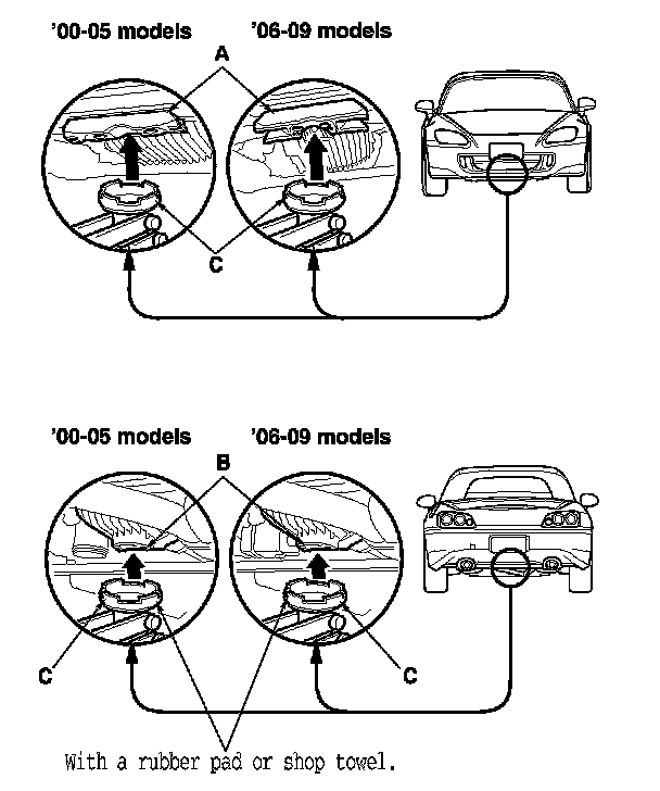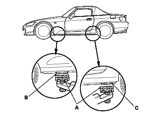 1. Position the lift blocks (A) under the vehicle's front support points (B) and rear support points (C).