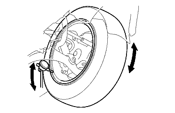 5. If the wheel runout is out of specification, check the wheel bearing end play, Testing and Inspection and make sure the mating surfaces on the brake disc and the inside of the wheel are clean.