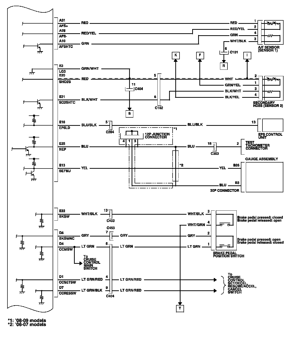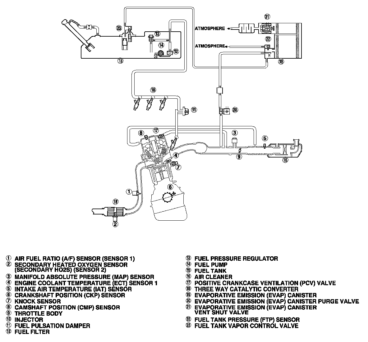 The secondary HO2S detects the oxygen content in the exhaust gas downstream of the three way catalytic converter (TWC), and sends signals to the ECM which varies the duration of fuel injection accordingly. To stabilize its output, the sensor has an internal heater. The ECM compares the HO2S output with the A/F sensor output to determine catalyst efficiency. The secondary HO2S is on the TWC.