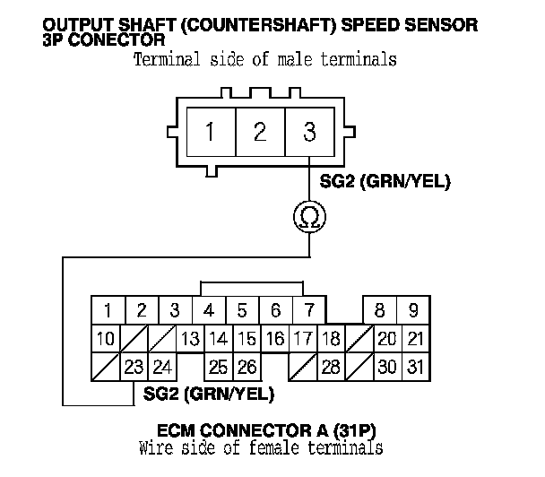 4. Check for continuity between output shaft (countershaft) speed sensor 3P connector terminal No. 3 and ECM connector A (31P) terminal No. 23.