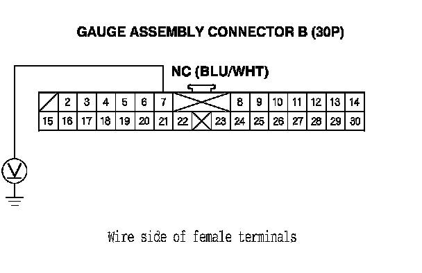 8. Measure the voltage between gauge assembly connector B (30P) terminal No. 7 and body ground.