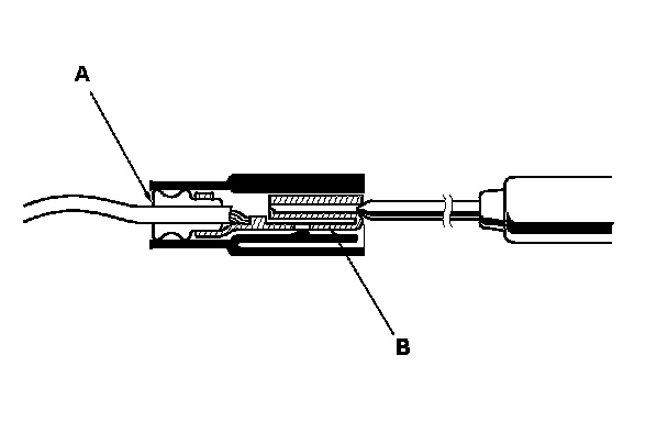 3. If you cannot get to the wire side of the connector or if the wire side is sealed (A), disconnect the connector, and probe the terminals (B) from the terminal side. Do not force the probe into the connector.