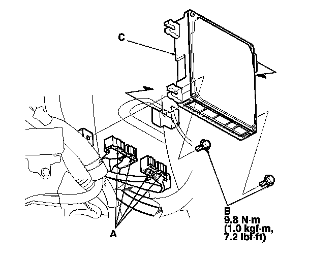 10. Remove the bolts (B), then remove the ECM (C).