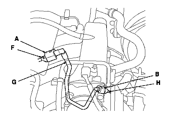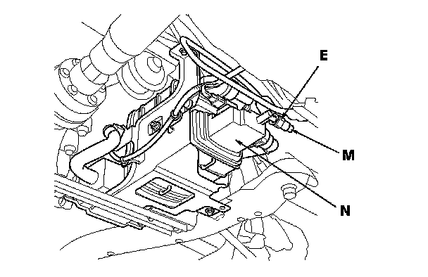 The fuel tube/quick-connect fittings (A), (B), (C), (D), (E) connect the fuel rail (F) to the fuel feed hose (G), the fuel feed hose to the fuel line (H), the fuel line (I) to the fuel feed hose (J), the fuel feed hose (K) to the fuel tank unit (L), and the fuel vapor line (M) to the EVAP canister (N). When removing or installing the fuel feed hose, the fuel tank unit or the fuel tank, you need to disconnect or connect the quick-connect fittings.