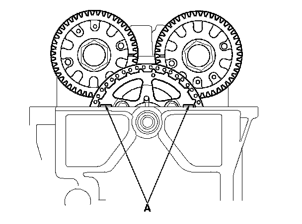 2. Set the No. 1 piston at top dead center (TDC). The TDC marks (A) on the cam chain sprocket should align with the cylinder head surface.