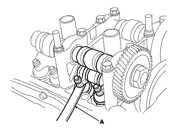 4. Insert the feeler gauge (A) between the adjusting screw and the end of the valve stem and slide it back and forth; you should feel a slight amount of drag.