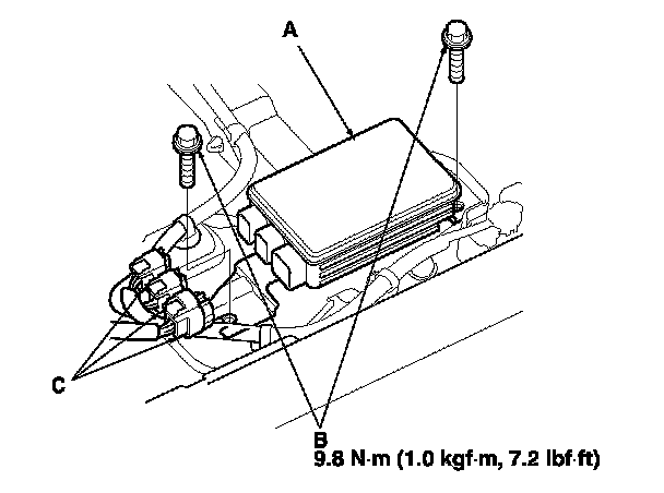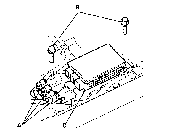1. Place the passenger's weight sensor unit (A) on the seat riser. Tighten the two mounting bolts (B) and connect the connectors (C).