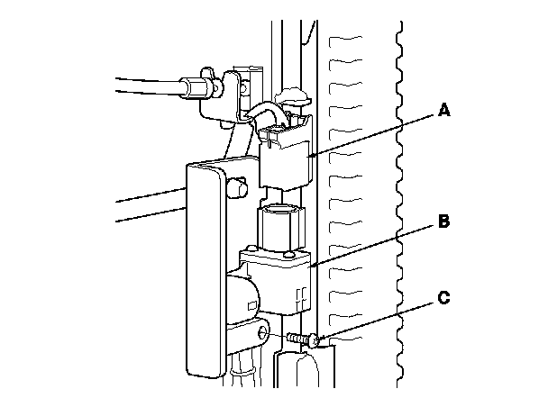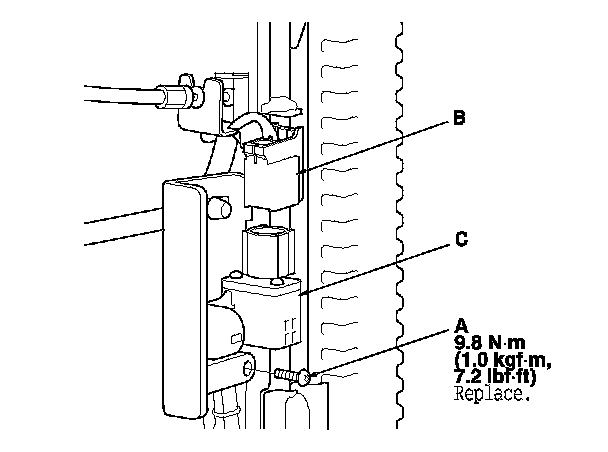 1. Install the driver's seat position sensor with a new TORX bolt (A), then connect the rear harness 2P connector (B) to the driver's seat position sensor (C).