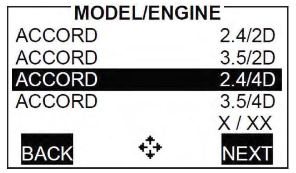 11. Scroll through the list and select the Honda MODEL/ENGINE you are testing, and press NEXT to continue.
