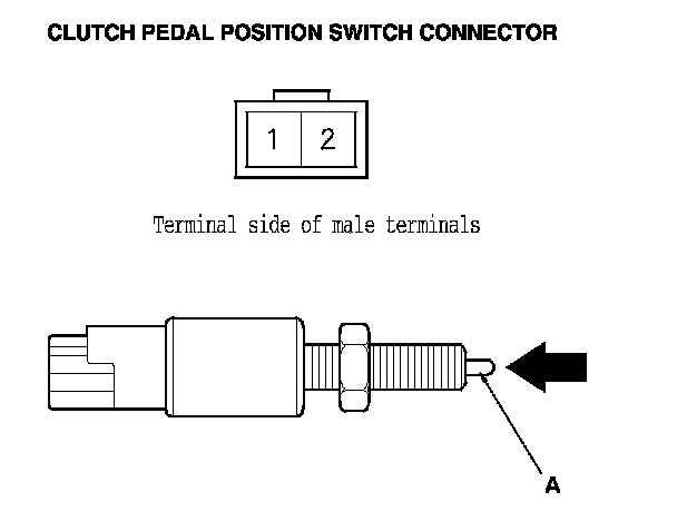 2. Check for continuity between the clutch pedal position switch connector terminals. There should be no continuity between the terminals with the switch (A) released, and there should be continuity with the switch pressed.