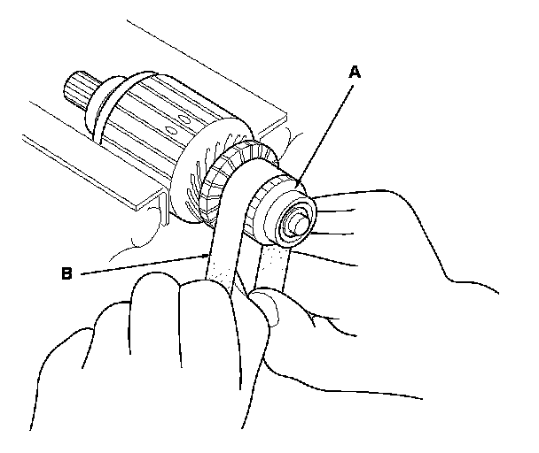 4. Check the commutator (A) surface. If the surface is dirty or burnt, resurface it with an emery cloth or a lathe to the specifications in step 5, or recondition with #500 or #600 sandpaper (B).