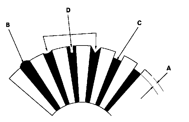 7. Check the mica depth (A). If the mica is too high (B), undercut the mica with a hacksaw blade to the proper depth. Cut away all the mica (C) between the commutator segments. The undercut should not be too shallow, too narrow, or V-shaped (D).