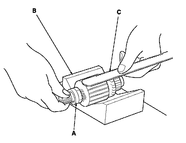 9. Place the armature (A) on an armature tester (B). Hold a hacksaw blade (C) on the armature core.