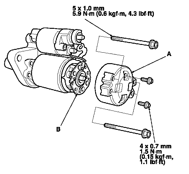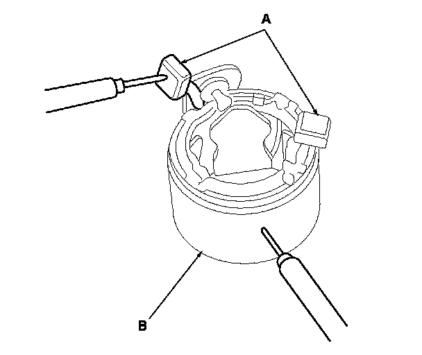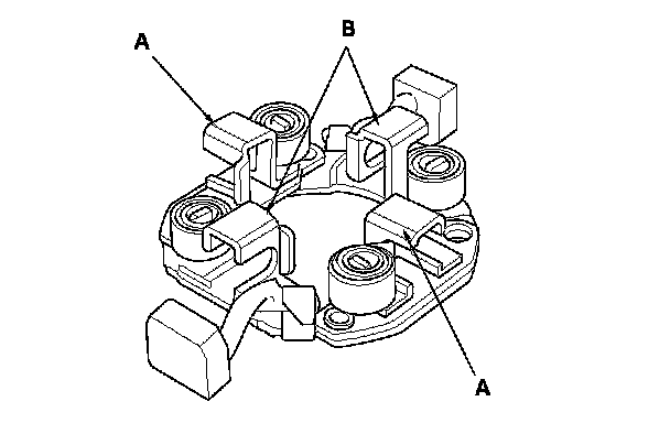 14. Check for continuity between the (+) brush holder (A) and the (-) brush holder (B). If there is continuity, replace the brush holder assembly.
