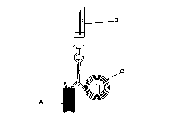 15. Insert the brush (A) into the brush holder, and bring the brush into contact with the commutator, then attach a spring scale (B) to the spring (C). Measure the spring tension at the moment the spring lifts off the brush. If the spring tension is not to specification, replace the brush holder assembly.