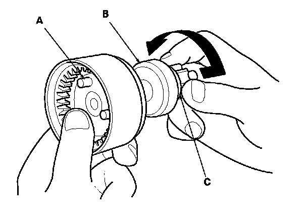 19. If the starter drive gear (C) is worn or damaged, replace the overrunning clutch assembly; the gear is not available separately. Check the condition of the flywheel ring gear. Replace it if the starter drive gear teeth are damaged.