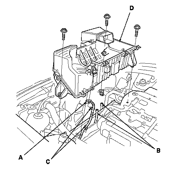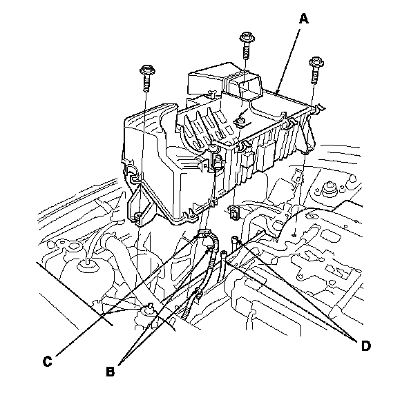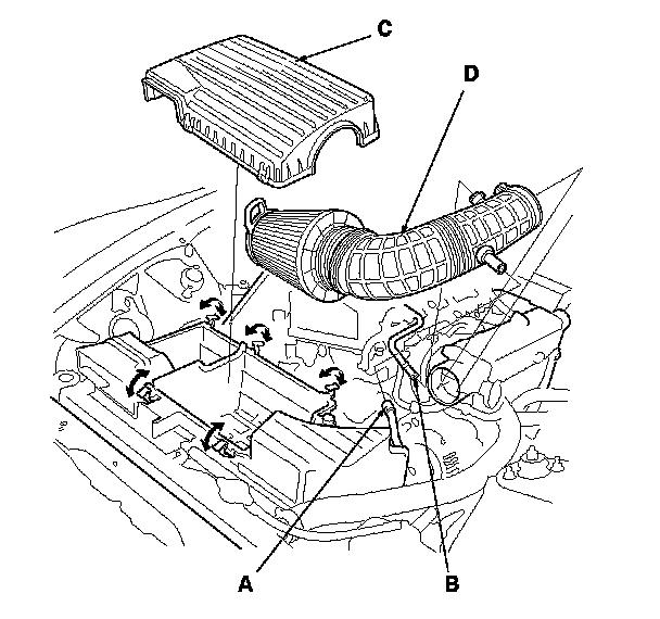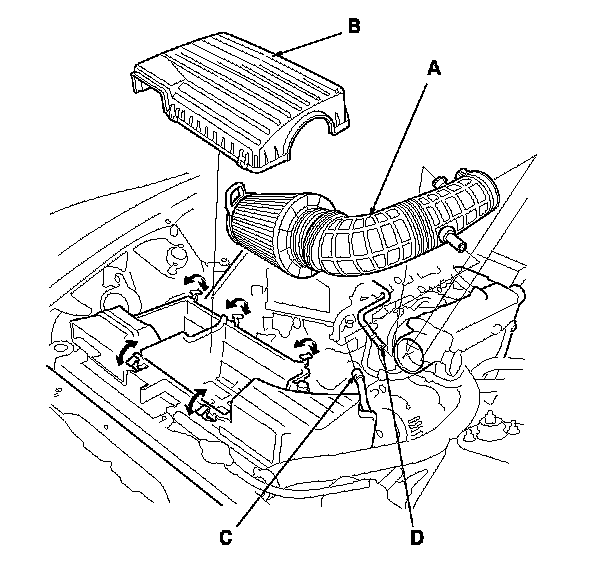 4. '00-05 models: Disconnect the air control solenoid valve connector (A) and the vacuum hoses (B), remove the harness clamps (C), then remove the air cleaner housing (D).