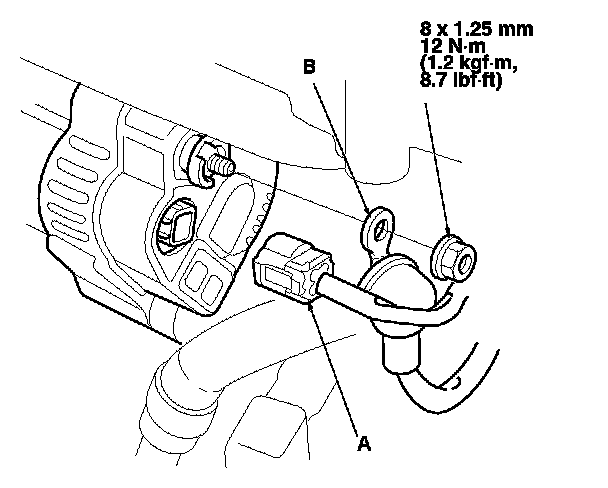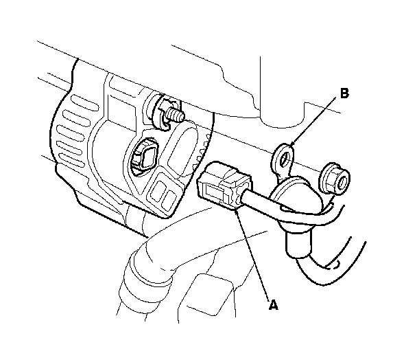 7. Disconnect the 4P connector (A) and the positive alternator cable (B) from the alternator.