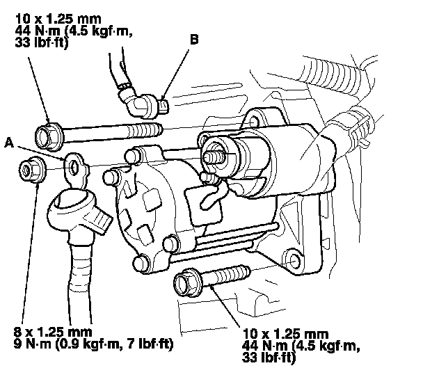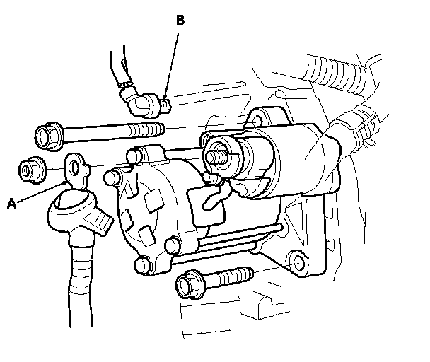 1. Install the starter, then connect the positive starter cable (A) and the BLK/WHT wire (B) to the starter. Make sure the crimped side of the ring terminal faces away from the starter when you connect it.