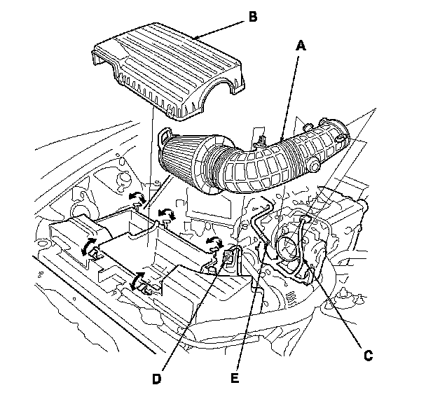 3. '06-09 models: Disconnect the intake air temperature (IAT) sensor connector (A) and the breather pipe (B), remove the manifold absolute pressure (MAP) sensor harness (C) from the holder, then remove the air cleaner housing cover (D) and the air cleaner assembly (E).