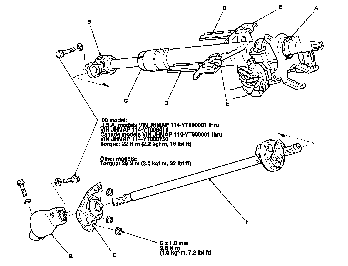 - Check the sliding capsules (E) for distortion or breakage. If there is distortion or breakage, replace the steering column as an assembly.