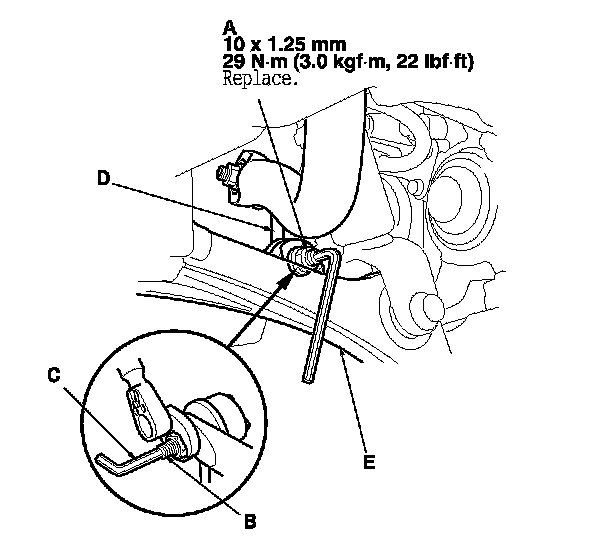 3. Remove the flange nut (A) while holding the joint pin (B) with a hex wrench (C), and disconnect the stabilizer link (D) from the lower arm (E).