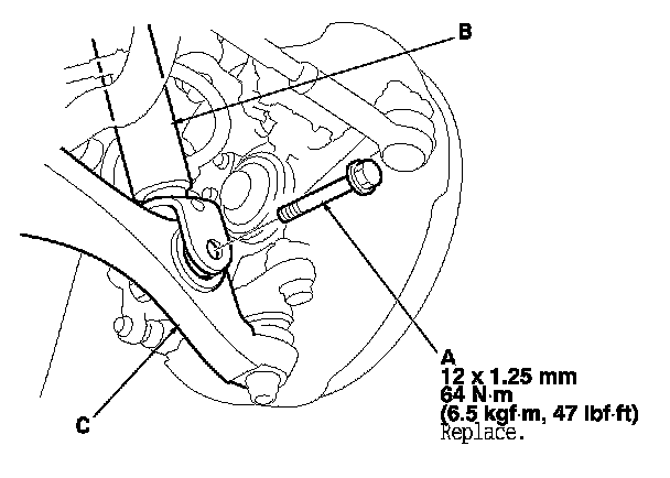 4. Remove the flange bolt (A), and disconnect the damper (B) from the lower arm (C).