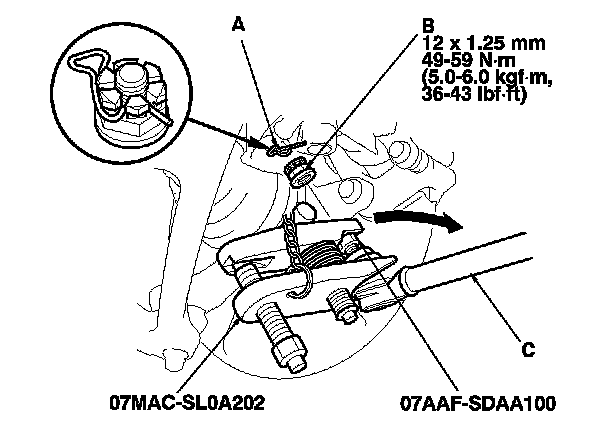 NOTE: Turn the control arm (C) outward to install the ball joint remover.