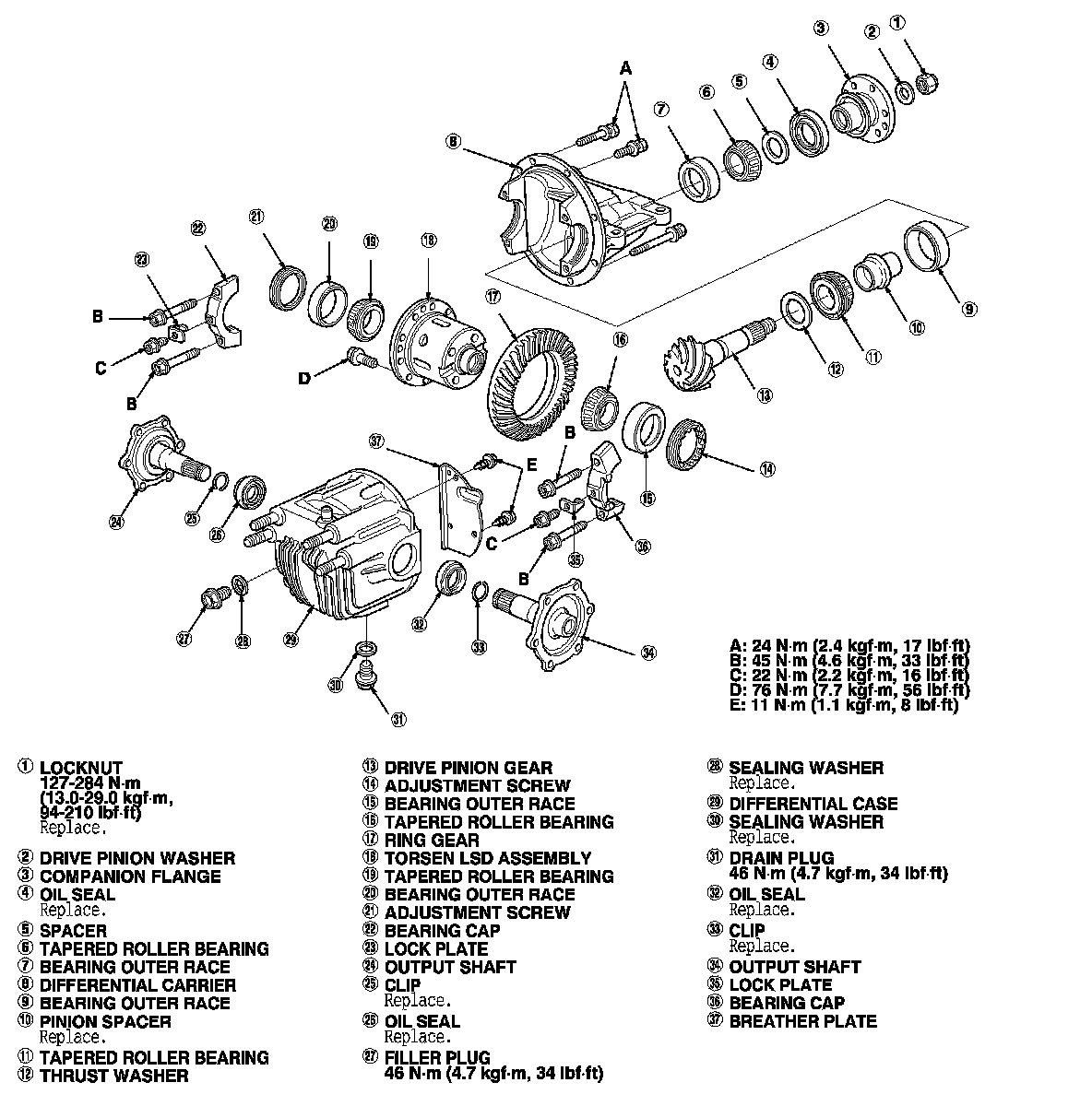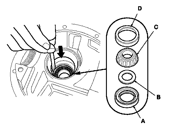 11. Remove the oil seal (A), the spacer (B), the tapered roller bearing (C), and the bearing outer race (D) from the differential carrier.