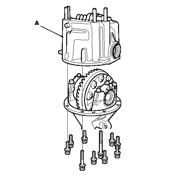 4. Remove the ten mounting bolts in a crisscross pattern in several steps, then remove the differential case (A).