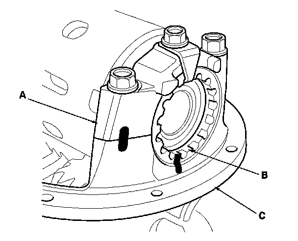 5. Make marks on the bearing cap (A), the adjustment screw (B), and the differential carrier (C).