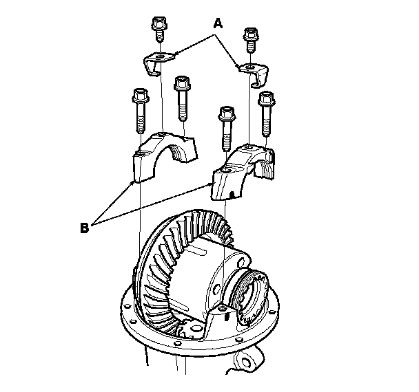 6. Remove the lock plates (A) and the bearing caps (B).