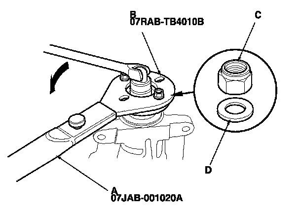 8. Install the holder handle (A) and the companion flange holder (B) on the companion flange, then remove the locknut (C) and the pinion washer (D).