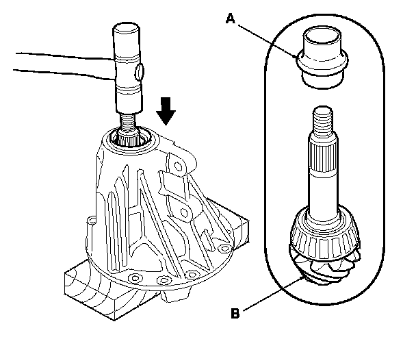 10. Support the differential carrier with a wood block under the driver pinion gear. Remove the pinion spacer (A) and the drive pinion gear (B) by tapping on the drive pinion using a plastic hammer.